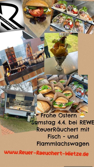 Räucherfisch , Fischbrötchen , BBQ/Grill , Suppen , Flammlachs, SüßerWagen uvm , auch Platten und Fingerfood außer haus